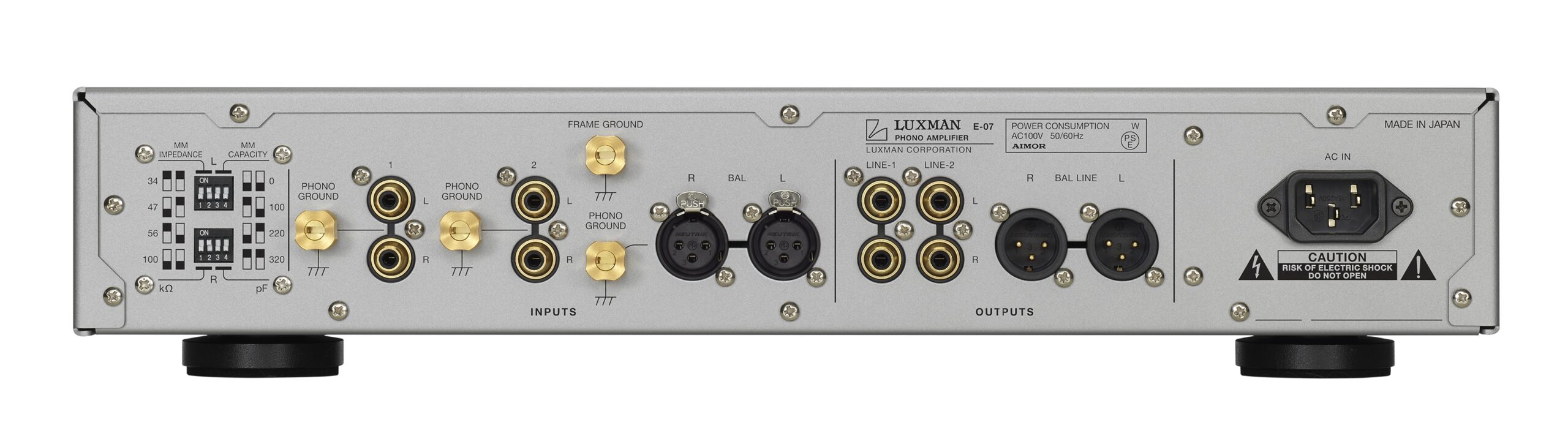 The E-07 features a six-position rotary load impedance selector for MC cartridges (4.7/10/40/100/300/1kΩ) on the front panel. The rear panel has load impedance selector switches for MM cartridges (34/47/56/100kΩ) as well as load capacitance selector switches (0/100/220/320pF). This allows for more precise adjustments to fully maximize the sound quality across a wide range of phono cartridge types.